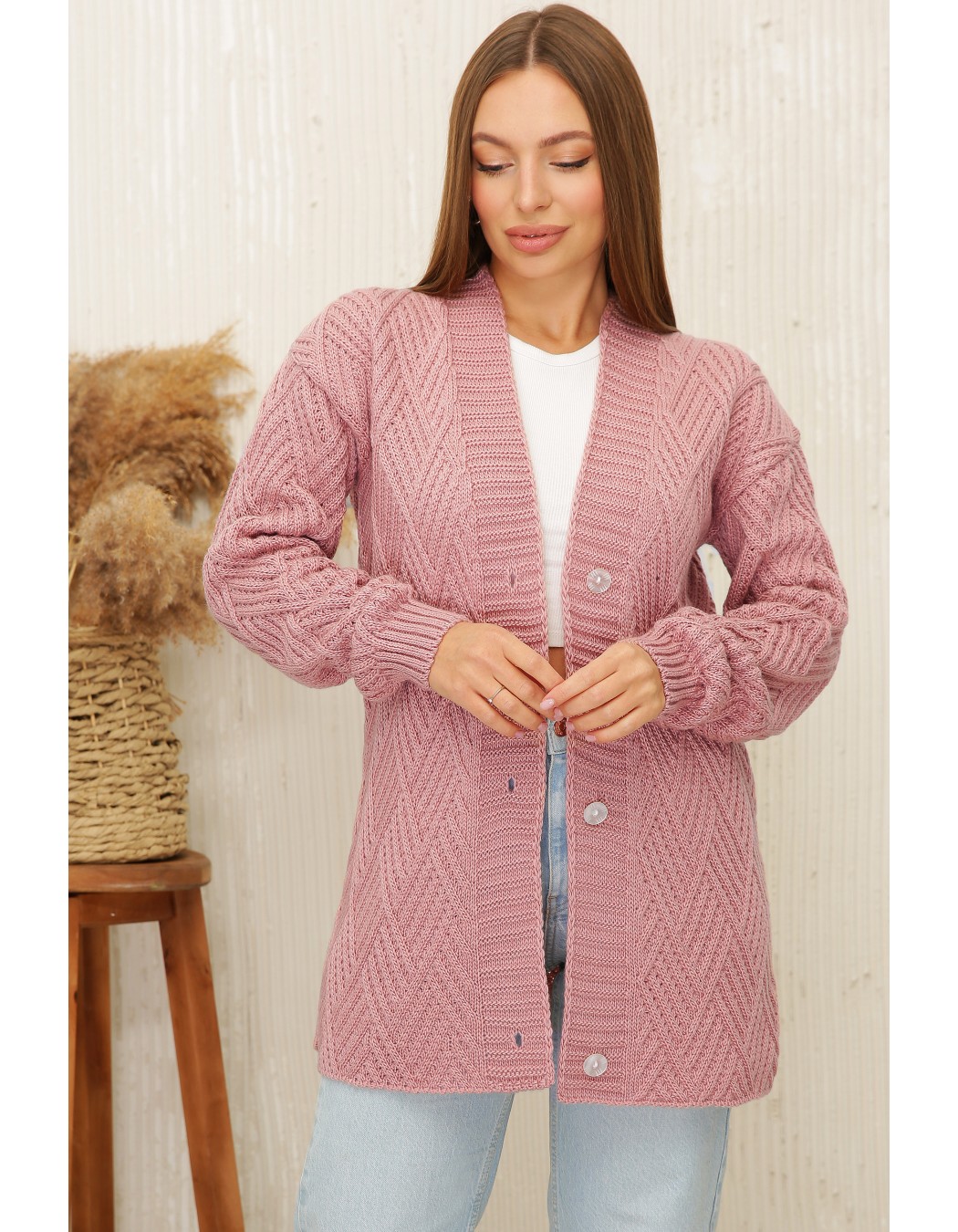 Модный женский кардиган цвета роза на пуговицах с элементами вязки