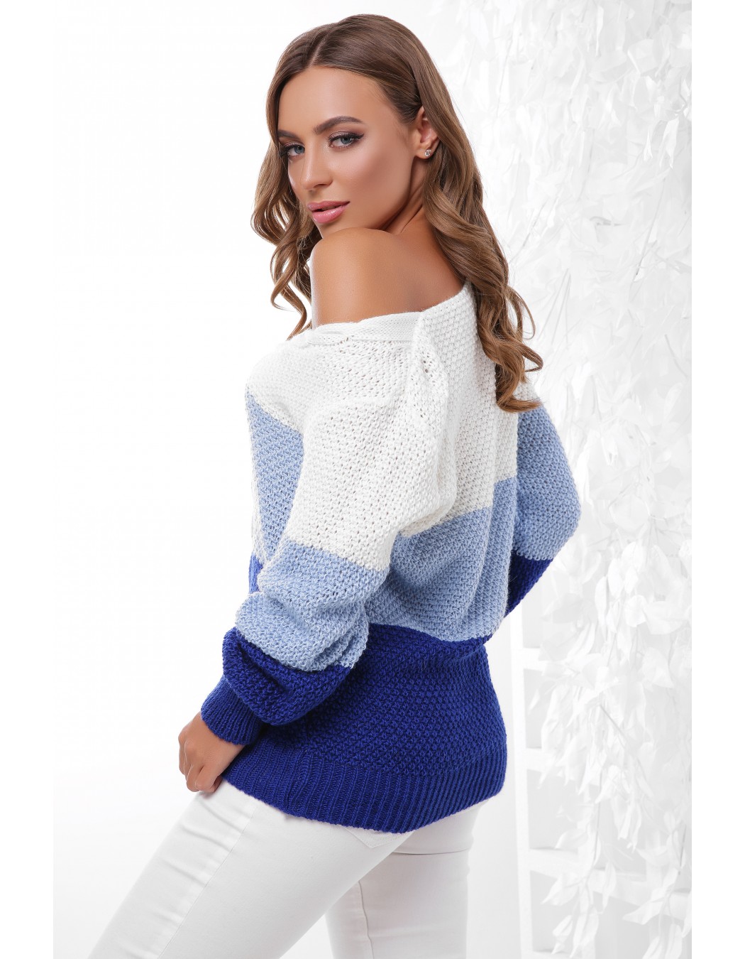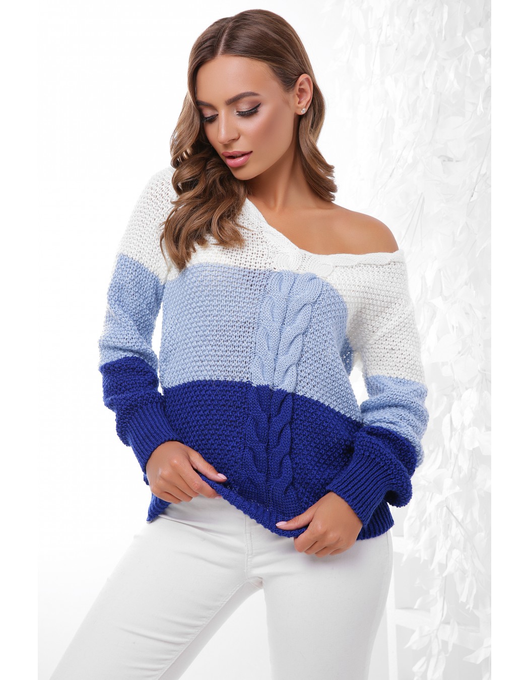 Этот трехцветный женский джемпер с V-образным вырезом станет настоящим акцентом вашего гардероба. Молоко-голубой-электрик - это стильное сочетание цветов, которое не оставит равнодушной ни одну модницу.