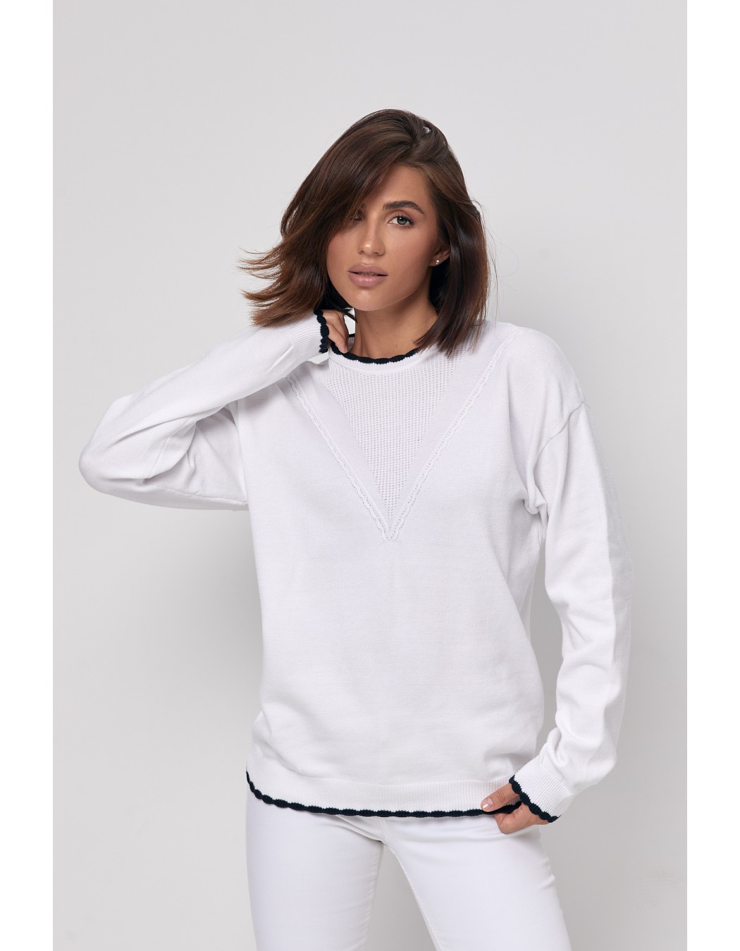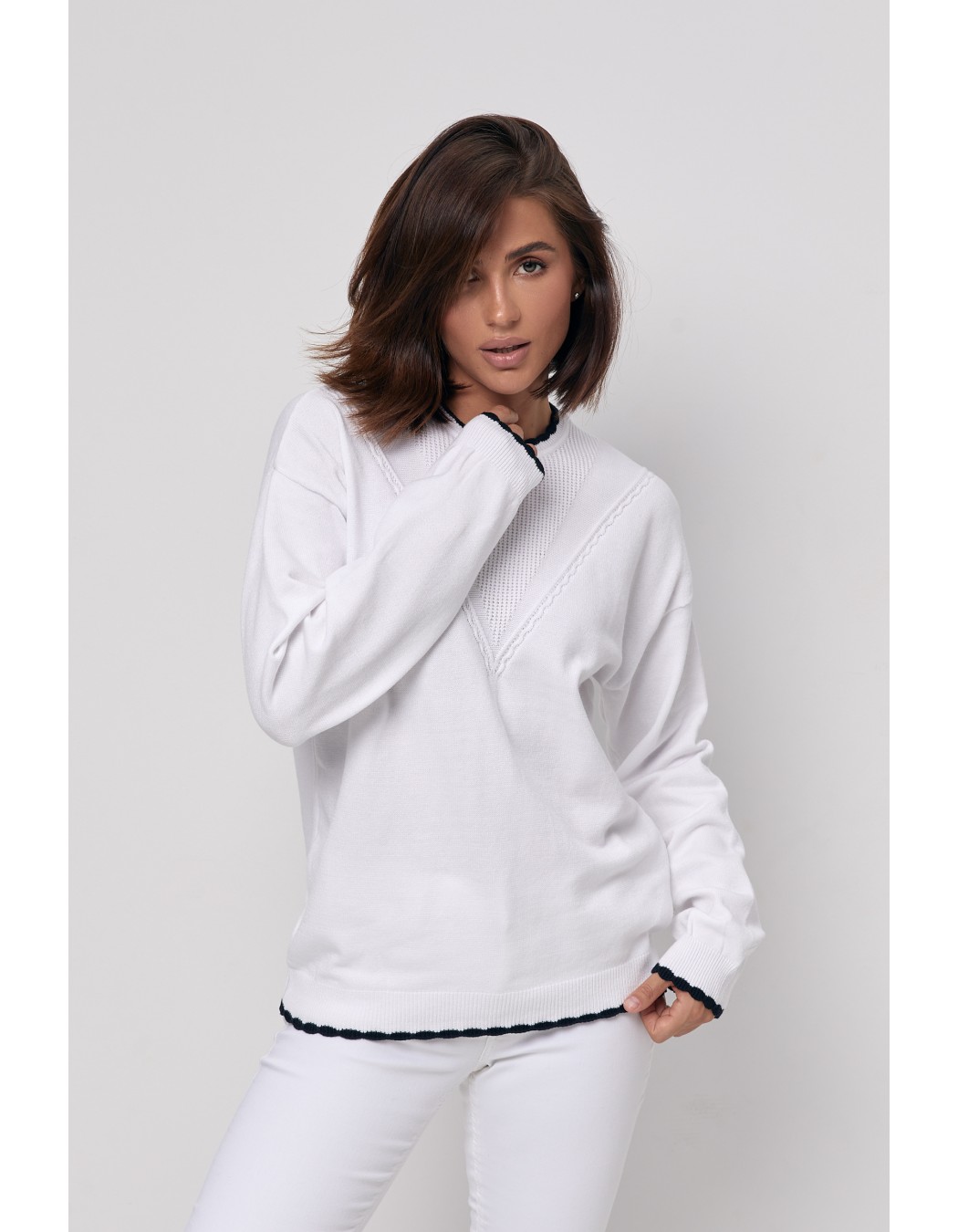 Вязаный женский джемпер молочного цвета, создающий мягкий стильный образ.