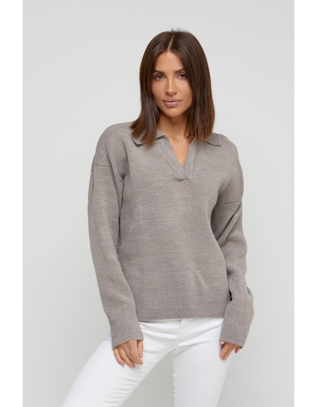 Вязаный женский свитер цвета кофе в стиле поло